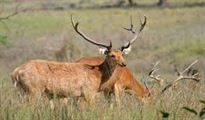 The barasingha is a large deer with a shoulder height of 44 to 46 in (110 to 120 cm) and a head-to-body length of nearly 6 ft (180 cm). Its hair is rather woolly and yellowish brown above but paler below, with white spots along the spine. The throat, belly, inside of the thighs and beneath the tail is white. In summer the coat becomes bright rufous-brown. The neck is maned. Females are paler than males. Young are spotted.